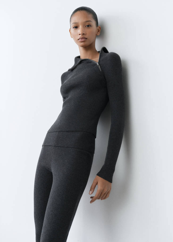 Žebrovaná pletenina. Jemný úplet. Přiléhavý design. Vysoký límec se zapínáním na zip. Dlouhý rukáv. Total look