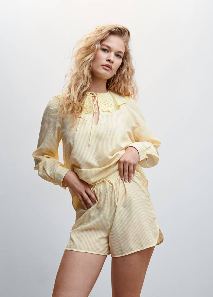 Krátké pyžamo se strukturouHistorie cenPůvodní cena přeškrtnutá [1 599 Kč ]1 599 KčAktuální cena [1 099 Kč ]1 099 Kč-31 %Vyberte barvuŽlutáModelka má na sobě velikost S a měří 176cm.Zvolte svou velikostSNení k dispozici. Chci to!MNení k dispozici. Chci to!LNení k dispozici. Chci to!RozměryProsím o upozorněníSouprava pyžamového trička a kalhot. Tkanina se vzorem. Rovný střih. Krátký střih. Výstřih s límečkem. Dlouhý rukáv s knoflíčky. Zavazování na stuhuPodrobnosti, složení a péčeDostupnost v obchodě