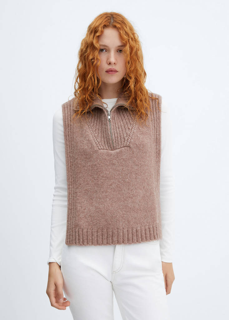 Hrubá pletenina. Rovný střih. Rolák. Boční rozparky. Bez rukávů. Zapínání na zip u krku