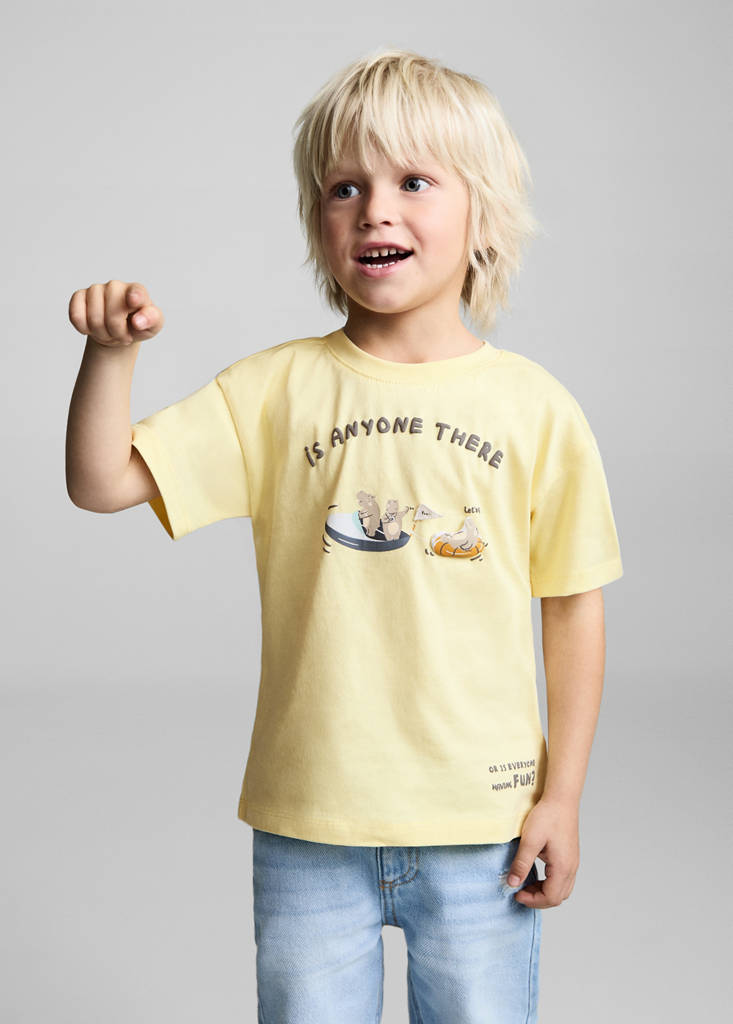 100% Cotton. Straight design. Short design. Embossed print on the front. Round neck with ribbed finish. Short sleeves