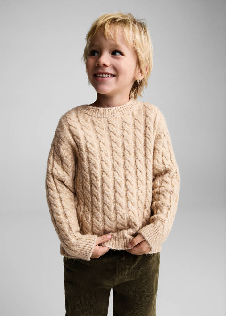 Back to class. Chunky knit fabric. Straight design. Knitted braided fabric. Round neck. Long sleeves. Button closure. Standard design