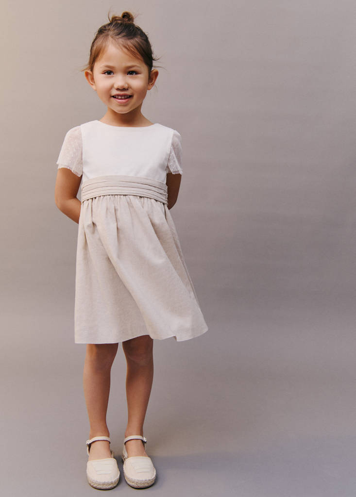 Cotton and linen fabric. Short design. Round neck. Short sleeves. Button fastening on the back section. Draped waist. Gathered Waist. Party, ceremony and communion collection