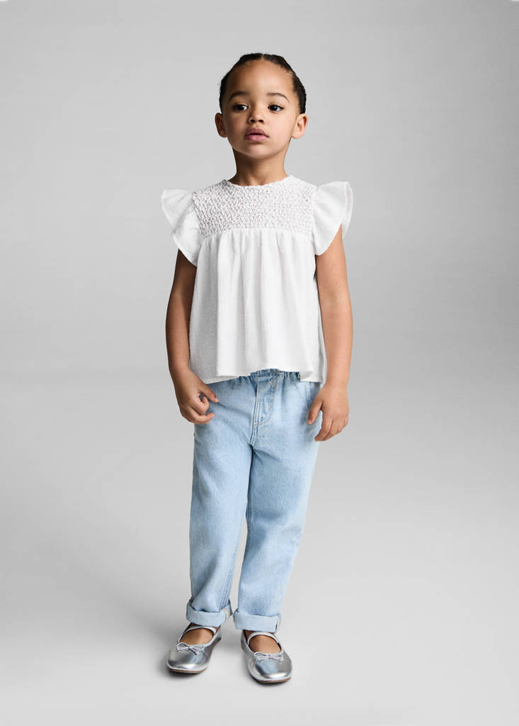 100% Cotton. Textured fabric. Straight design. Round neck. Short-sleeved ruffle. Ruched details. Embroidered details. Contrast detail