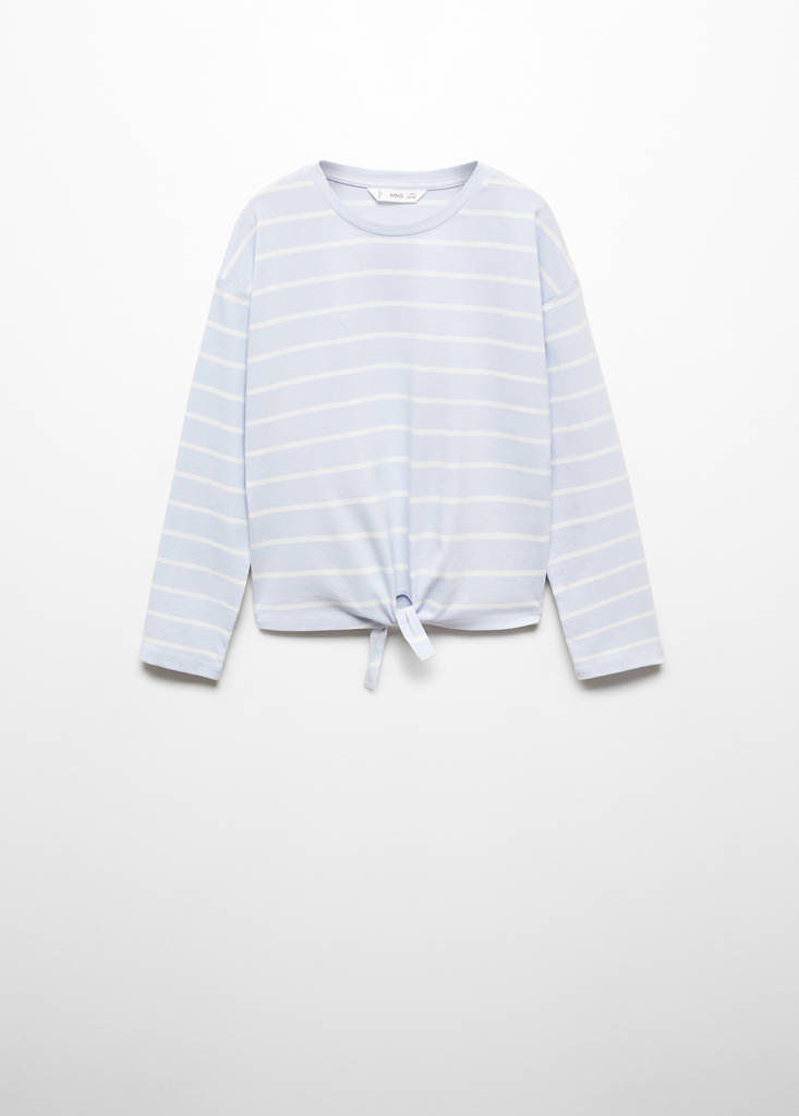 Knotted striped t-shirtPrice historyInitial price struck through [299 Kč ]299 KčCurrent price [229 Kč ]229 Kč-23%Select a colourSky BlueSelect your size5-6 years (116cm)Last few items!7-8 years (128cm)Not available. I want it!9-10 years (140cm)Not available. I want it!11-12 years (152cm)Not available. I want it!13-14 years (164cm)Not available. I want it!MeasurementsAddStriped print. Straight Design. Knot detail. Round neck. Long sleeves. Knot closureDetails, composition and careStore availabilityItem qualitiesRecycled cottonAt least 20%This fibre is obtained from pre- and post-consumer textile waste that is transformed into new fabrics.