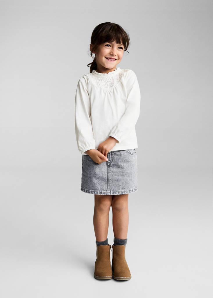 100% Cotton. Long sleeves. Round neck with ruffles. Elastic pleats at front. Gathered detail on the sleeves