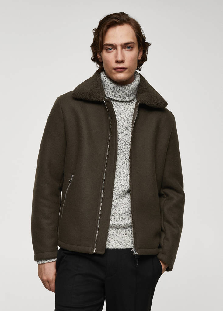 Wool mix fabric. Faux shearling interior. Short design. Fleece-effect lapel collar. Front closure with metal zip. Zip pockets on both sides. Long sleeves. Straight hem