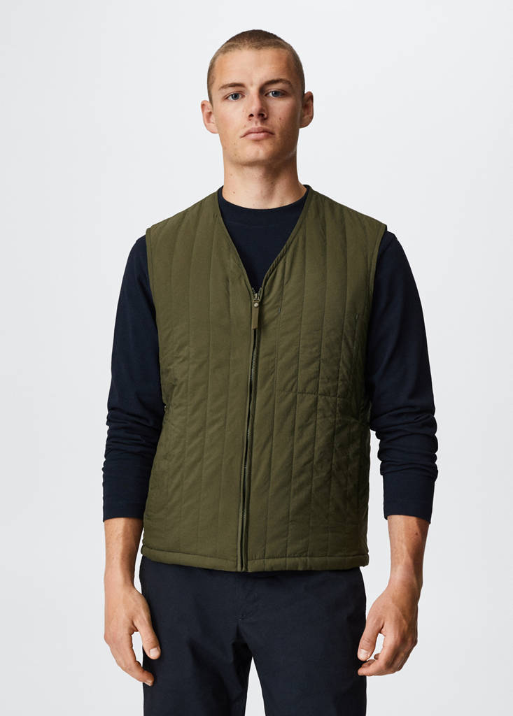 Quilted design. Short design. Water-repellent: The durable finish of this garment protects against light rain, repelling contact with water and raindrops. Thermoregulating: This fabric offers optimal breathability to keep you at a stable temperature. V-neck. Sleeveless. Zip pockets on both sides. Zip fastening. Inner lining. The model is wearing a size M