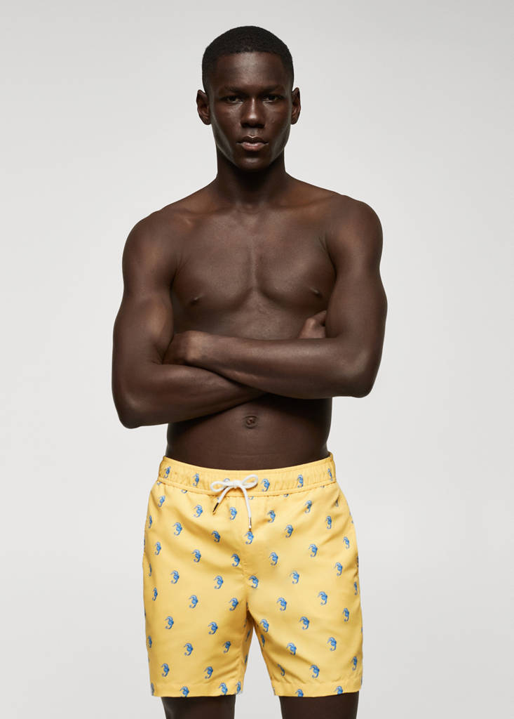 100% recycled polyester, seahorse print, elastic waist with adjustable drawstring, two side pockets, back patch pocket with Velcro, inner lining, the model is 190 cm tall and is wearing a size M.