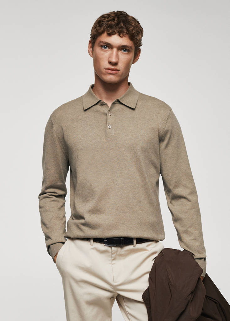 Sustainable cotton fabric. Fine knit fabric. Polo collar. Long sleeves with elastic cuffs. Elastic ribbed endings. Straight hem. The ink blue and beige models are online exclusives. Button up. Long sleeves