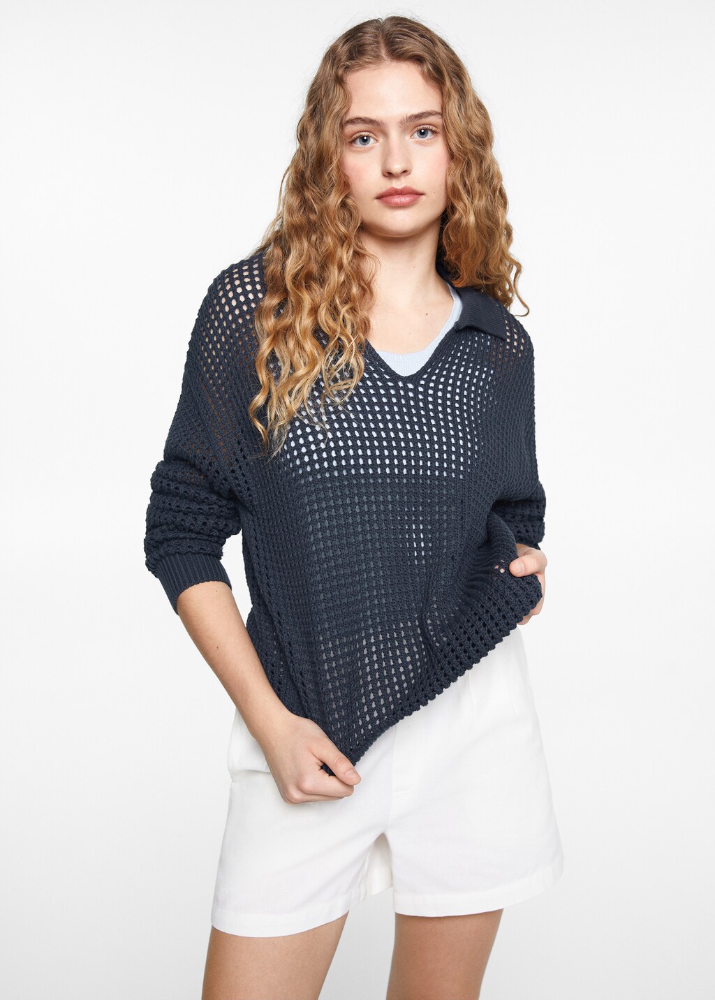 Chunky knit fabric. Open-knit fabric. Oversize design. Polo collar. Long sleeve.