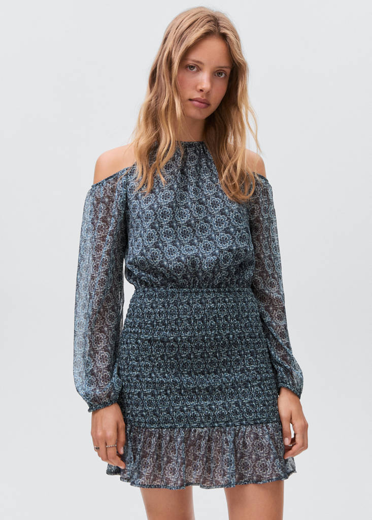 Fluid fabric. Short design. Round neck. Cut-out detail. Puffed sleeves. Elastic cuffs. Honeycomb gathered fabric. Honeycomb pattern. Frill on the bottom. Button closure at the back