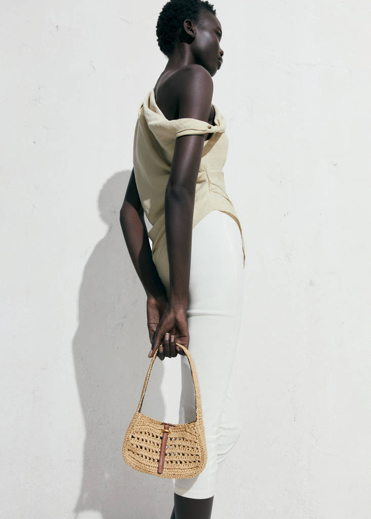 Natural fibre fabric. Mini size. Shoulder strap. Contrast detail. Metal snap closure