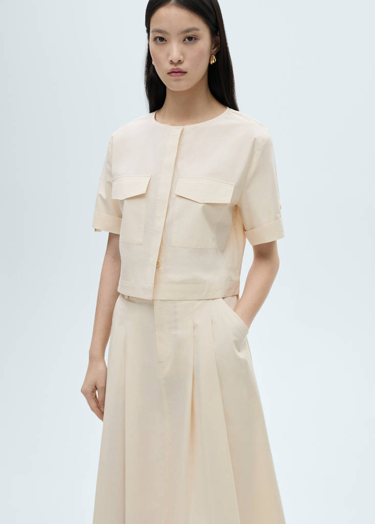 100% Cotton. Lightweight fabric. Crop design. Straight design. Round neck. Short sleeves with turn-up. Concealed button fastening. Button fastening at the front. Two front flap pockets