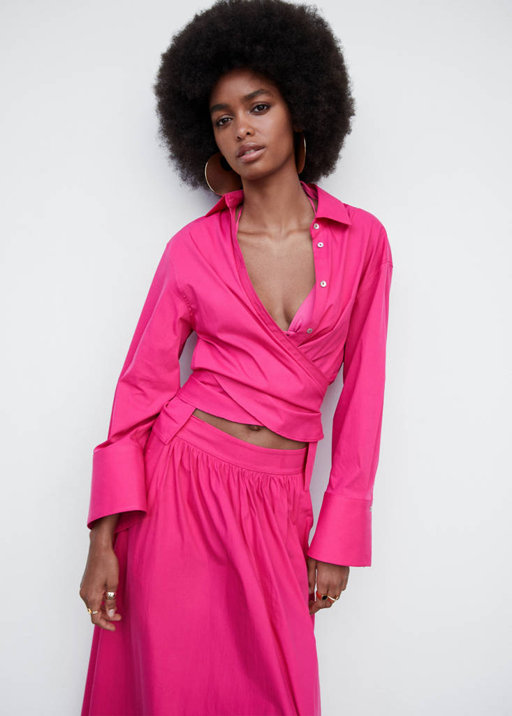 Cotton-blend fabric. Crossover design. Fitted design. Shirt-style collar. Long flared sleeve. Buttoned cuffs. Button fastening on the front section. Bow closing on the back