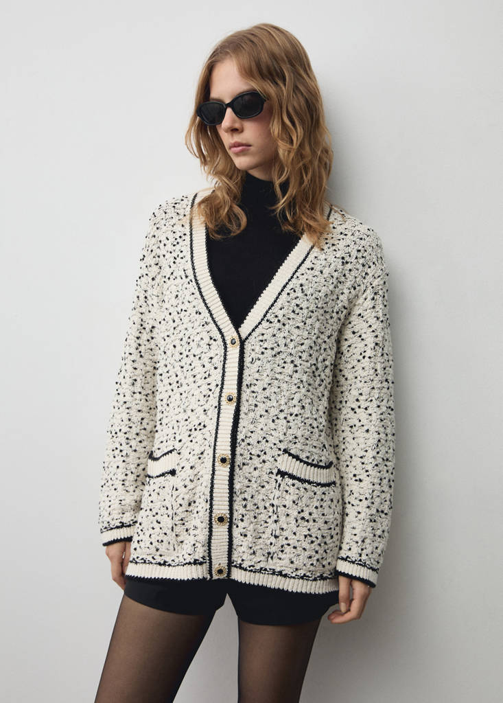 Chunky knit fabric. Flecked design. Oversized design. Long sleeves. V-neck. Button fastening at the front. Jewel-effect buttons. Contrast detail. Two patch pockets at the front