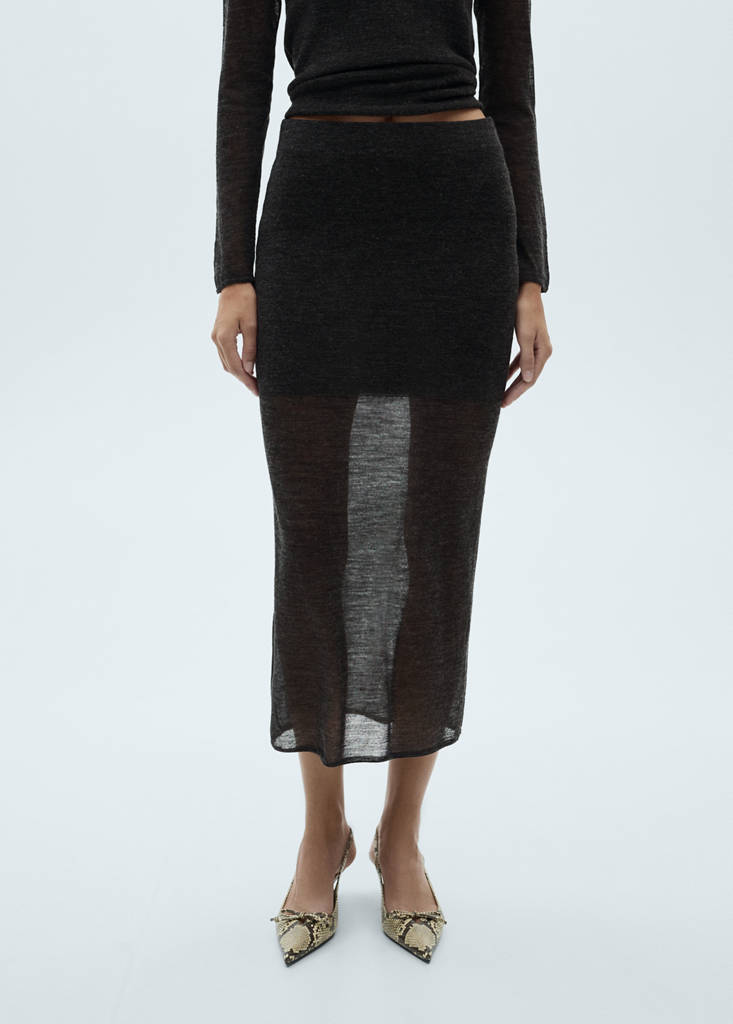 Wool mix fabric. Semi-transparent design. Elasticated waistband. Inner lining. Total look. Fine knit fabric. Straight design