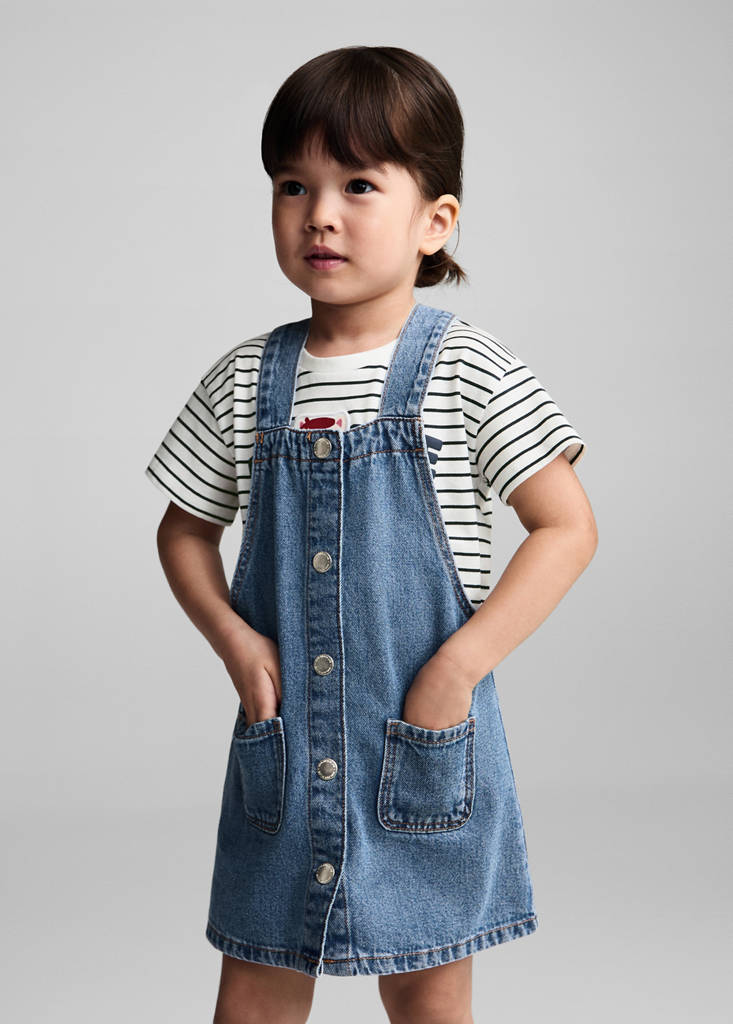 Zurück zur Schule Kollektion. 100% Baumwolle. Kurzes Design. Gerades Design. Zwei Vordertaschen. Metallclipverschluss. Knopfverschluss hinten. Druckknopfverschluss. Überkreuzter Rücken