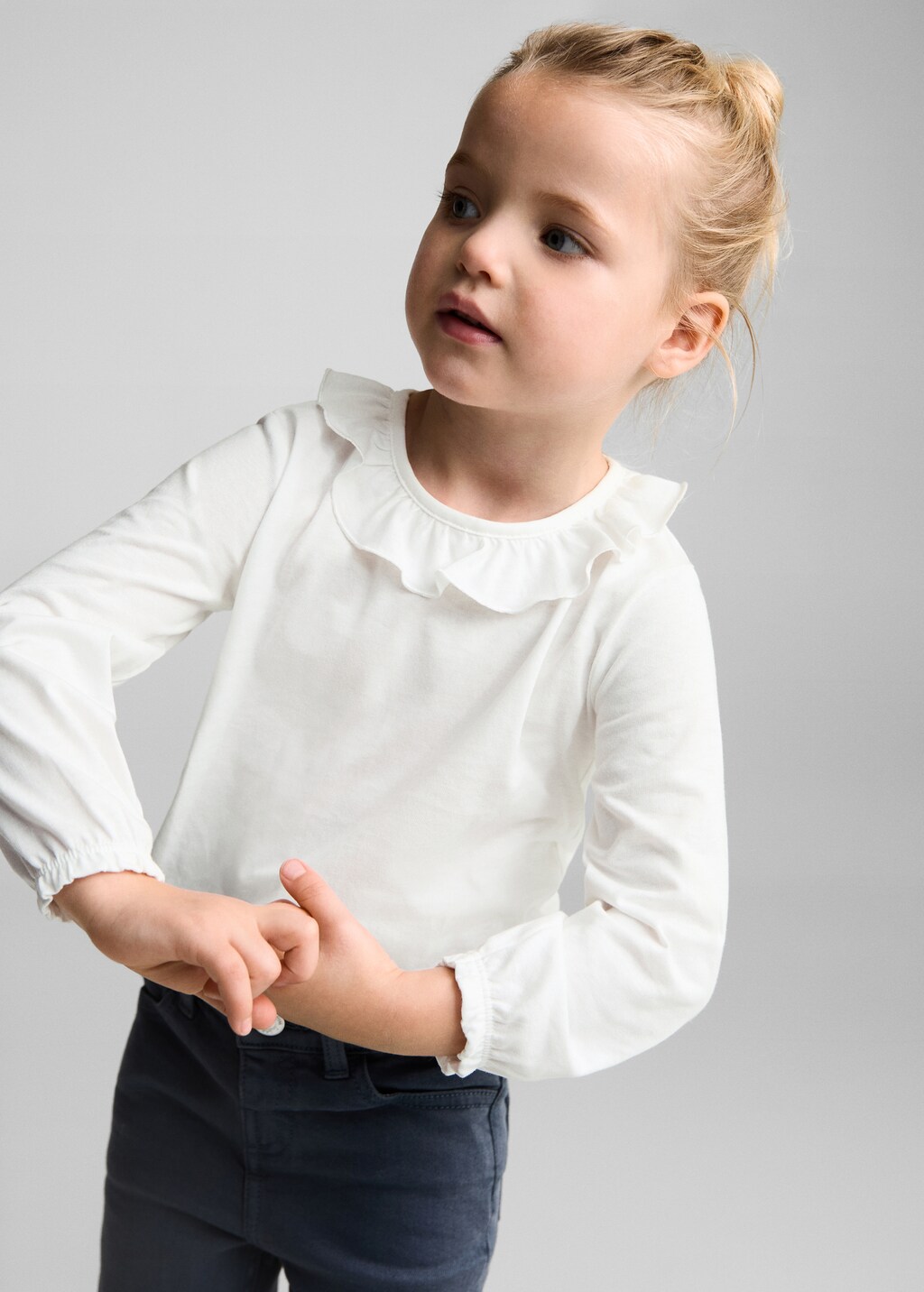 100% Baumwolle. Gerades Design. Volant-Detail am Ausschnitt. Knopfverschluss hinten. Rundhalsausschnitt. Back to School. Langer Ballonärmel.