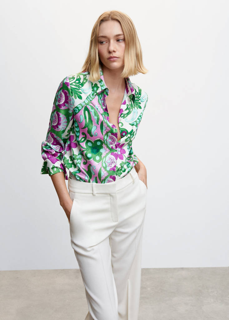 Satin. Fließender Stoff. Gerades Design. Print-Design. Hemdkragen. Lange Ärmel mit Knöpfen. Knopfverschluss vorne. Abgerundeter Saum