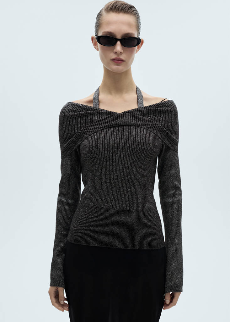 Rippstrickgewebe. Lurex-Gewebe. Off-Shoulder Design. Tailliertes Design. Schulterfrei. Umgeschlagenes Design. Lange Glockenärmel. Ohne Verschluss. Kollektion für Partys, Feierlichkeiten und Kommunionen