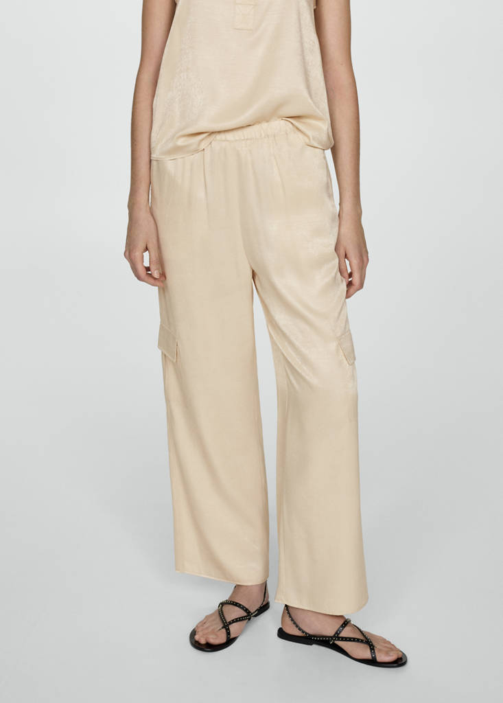 Fließender Stoff. Gerades Design. Langes Design. Zwei seitliche Taschen. Zwei Cargotaschen. Zwei Leistentaschen hinten. Elastischer Bund. Ohne Verschluss