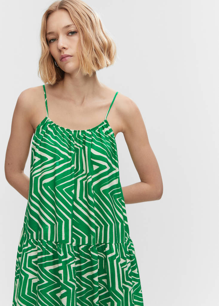 Fließender Stoff. Langes Design. Gerades Design. Rundhalsausschnitt. Regulierbare schmale Spaghettiträger. Gerüschte Details. Ausgestellter Saum. Bedrucktes Design