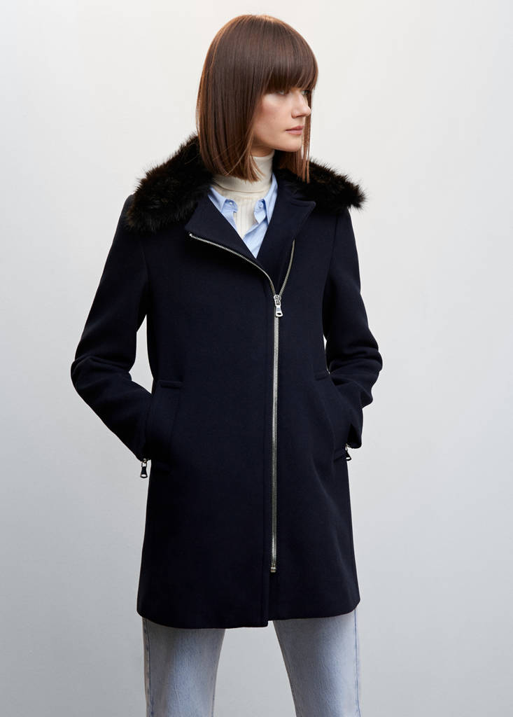 Mischgewebe aus Recycling-Wolle. Mittellanges Design. Abnehmbarer Kunstfellkragen. Reißverschluss. Seitentaschen. Lange Ärmel. Plus erhältlich
