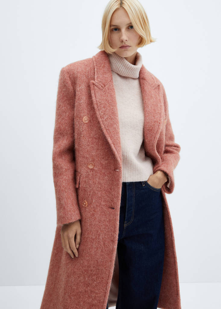 Woll-Mischgewebe. Gerades Design. Langes Design. Hemdkragen mit Revers. Lange Ärmel. Zwei Paspel- und Pattentaschen vorne. Zweireihiger Verschluss. Futter