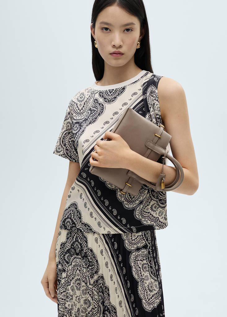 Leichter Stoff. Rundstrickgewebe. Asymmetrisches Design. Gerades Design. T-Shirt. Ärmelloses T-Shirt. Print: Paisleymuster. Ohne Verschluss. Standarddesign. Kurze Ärmel. Rundhalsausschnitt