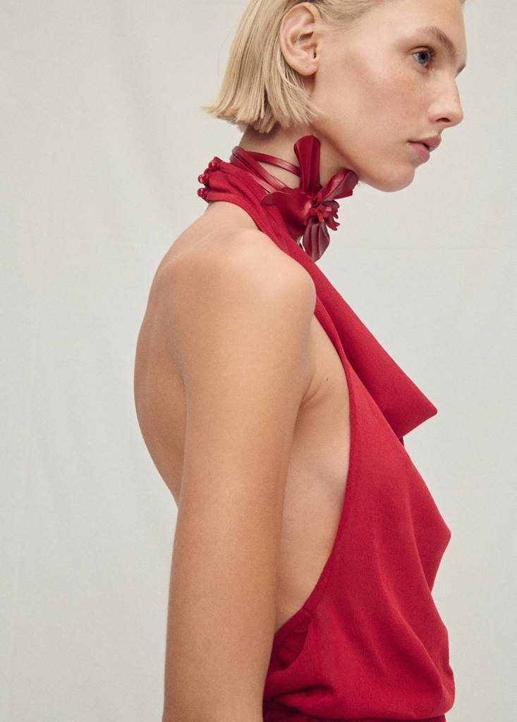 Feinstrick. Gerades Design. Drapierter Ausschnitt. Halterkragen. Offener Rücken. Schleifengürtel an der Taille. Asymmetrischer Saum. Knopfverschluss am Kragen. Selection-Kollektion