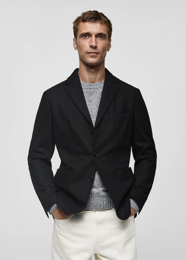 Teilweises Innenfutter. Mischgewebe aus Recycling-Wolle. Innentaschen. Knopfverschluss. Brustleistentasche. Saum mit Seitenschlitzen. Gerader Saum. Slim Fit. Fallendes Revers. Zwei aufgesetzte Taschen vorne