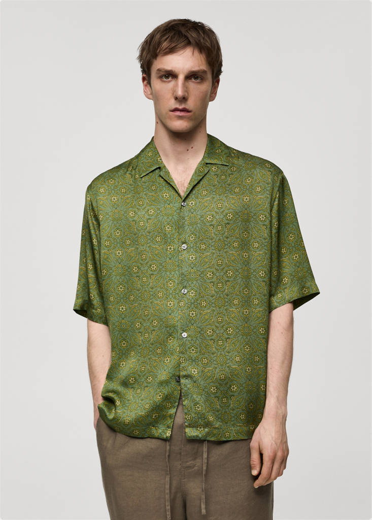 Fließender Stoff. Bowlingkragen. Kurze Ärmel. Gerader Saum. Vorderer Verschluss mit Knöpfen. Bedrucktes Design