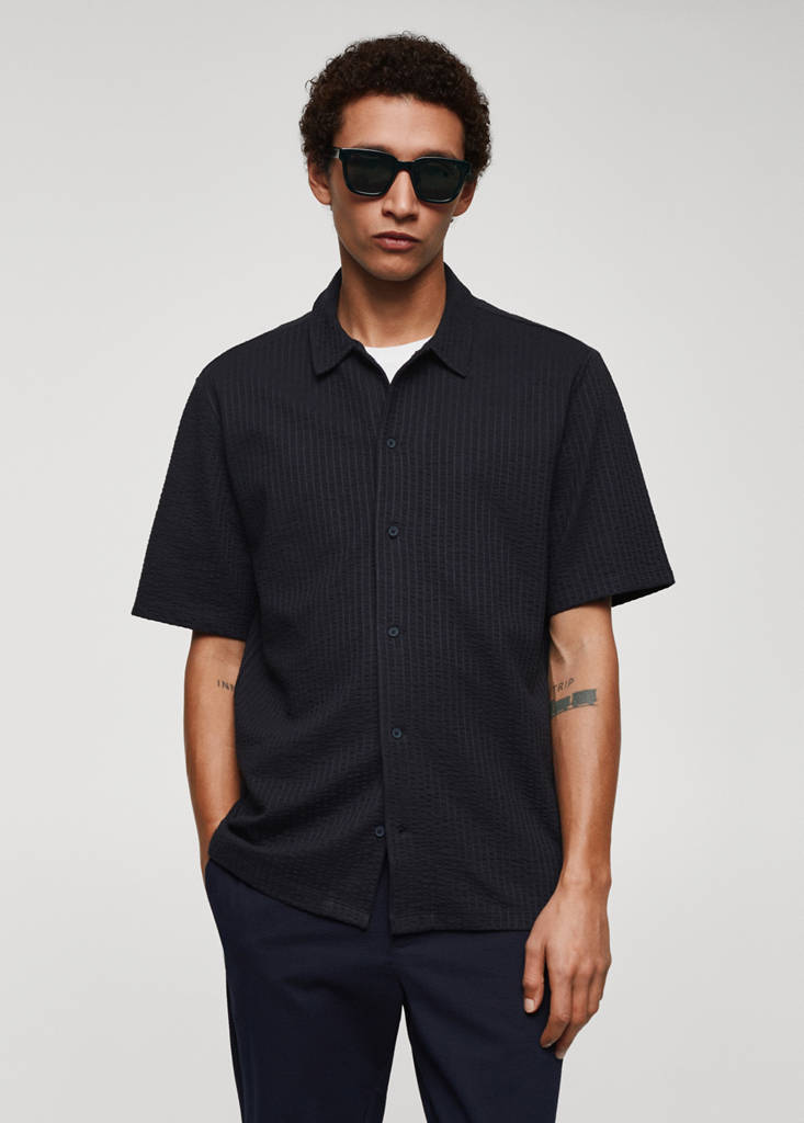 Set erhältlich als Total-Look. Baumwolle. Seersucker-Effekt. Hemdkragen. Kurze Ärmel. Gerader Saum. Vorderer Verschluss mit Knöpfen