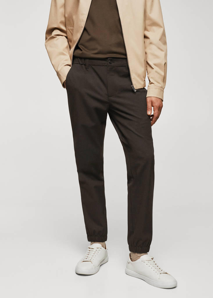 Slim Fit. Leicht elastisches Gewebe. Jogger-Design. Doppelter Knopf und Reißverschluss. Verstellbarer Kordelzug innen. Schlaufen für Gürtel. Zwei Vordertaschen. Saum mit elastischem Gummi. Zwei Pattentaschen hinten
