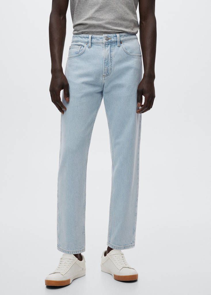 Basics-Kollektion. Crop-Design. Tapered Fit: oben weit geschnitten, vom Knie bis zum Knöchel schmaler werdend. Mischgewebe aus nachhaltiger Baumwolle. Baumwollstoff im Jeans-Stil. Farbe: Naturweiß. Gürtelschlaufen. Zwei seitliche Taschen. Münztasche. Zwei aufgesetzte Taschen auf der Rückseite. Reißverschluss und Knopfverschluss. Jeans-Stil