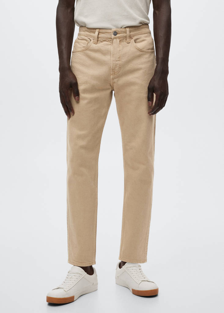 Basics-Kollektion. Crop-Design. Tapered Fit: oben weit geschnitten, vom Knie bis zum Knöchel schmaler werdend. Mischgewebe aus nachhaltiger Baumwolle. Baumwollstoff im Jeans-Stil. Farbe: Naturweiß. Gürtelschlaufen. Zwei seitliche Taschen. Münztasche. Zwei aufgesetzte Taschen auf der Rückseite. Reißverschluss und Knopfverschluss. Jeans-Stil
