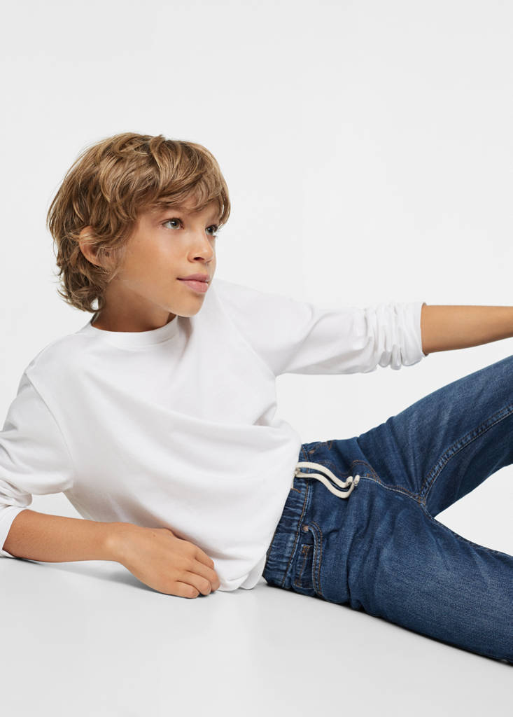 Jeansstoff. Gerades Design. Elastische Taille mit Tunnelzug. Fünf Taschen. Futter