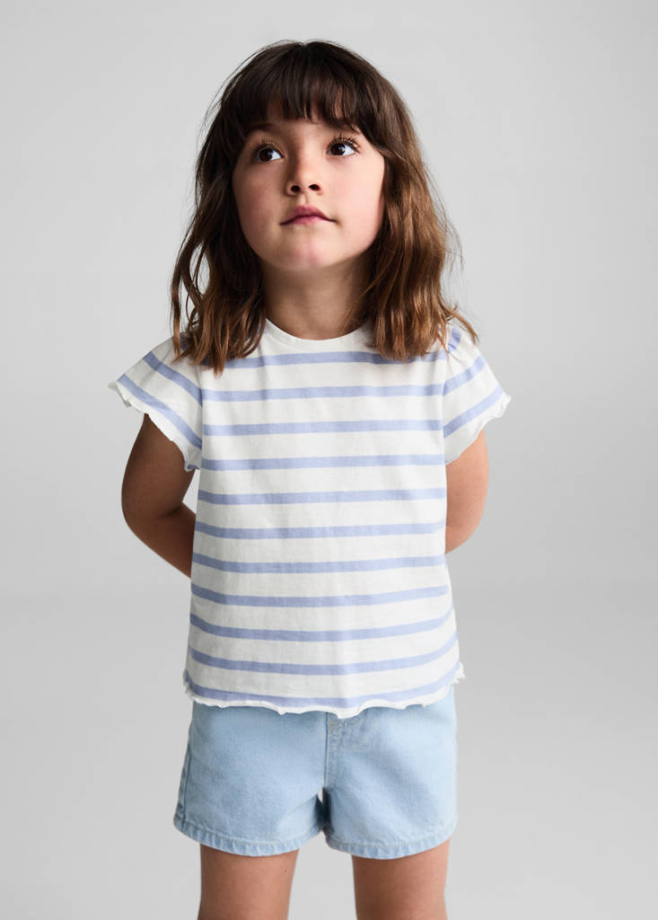 Ruffled striped t-shirtPrice historyInitial price struck through [kr 99 ]kr 99Current price [kr 69 ]kr 69-30 %Select a colourSky BlueSelect your size9-12 months (80cm)Not available. I want it!12-18 months (86cm)Not available. I want it!18-24 months (92cm)Not available. I want it!2-3 years (98cm)Not available. I want it!3-4 years (104cm)Not available. I want it!4-5 years (110cm)Not available. I want it!5-6 years (116cm)Not available. I want it!MeasurementsNotify meStriped print. Short sleeves. Ruffles on the sleeves. Round neck. Button closure. Summer campDetails, composition and careStore availabilityItem qualitiesRecycled cottonAt least 20 %This fibre is obtained from pre- and post-consumer textile waste that is transformed into new fabrics.