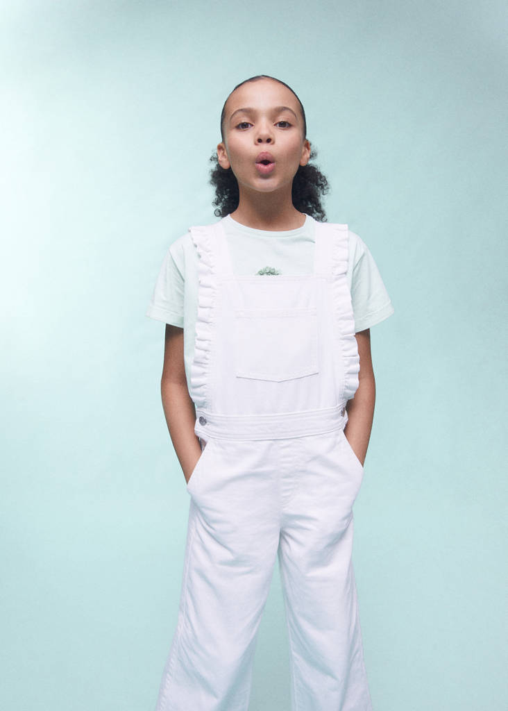 Denim style cotton fabric. Long design. Straight design. Straight neck. Straps. Frill detail on the shoulders. Patch pocket on the chest. Two side pockets. Side button fastening