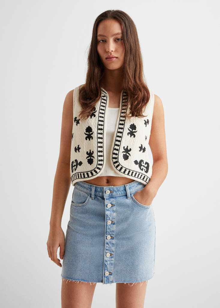 Print. Straight design. Short design. Rounded neck. Sleeveless. Unclosed