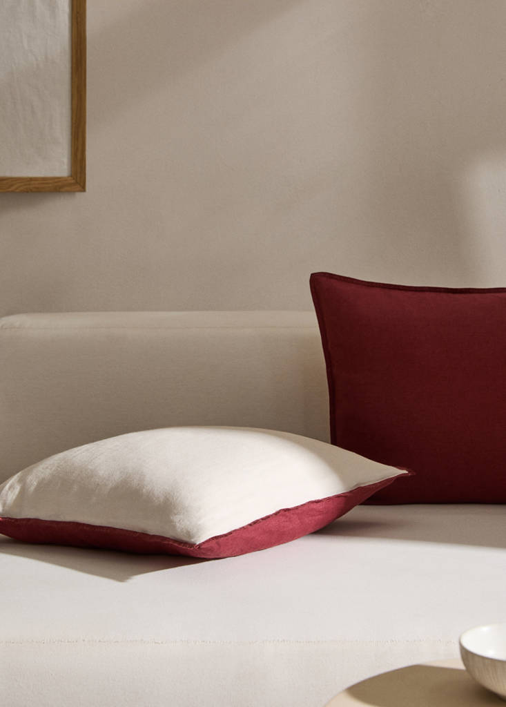 100% linen fabric. Linen becomes softer over time and is notable for its flexibility; slightly creased but there's no need to iron it. Plain fabric. Zip fastening. Filling not included. Two-tone design. Size: 45x45cm. Contrast trims. Decorative trim. Standard design with decorative trim detail to decorate all types of homes