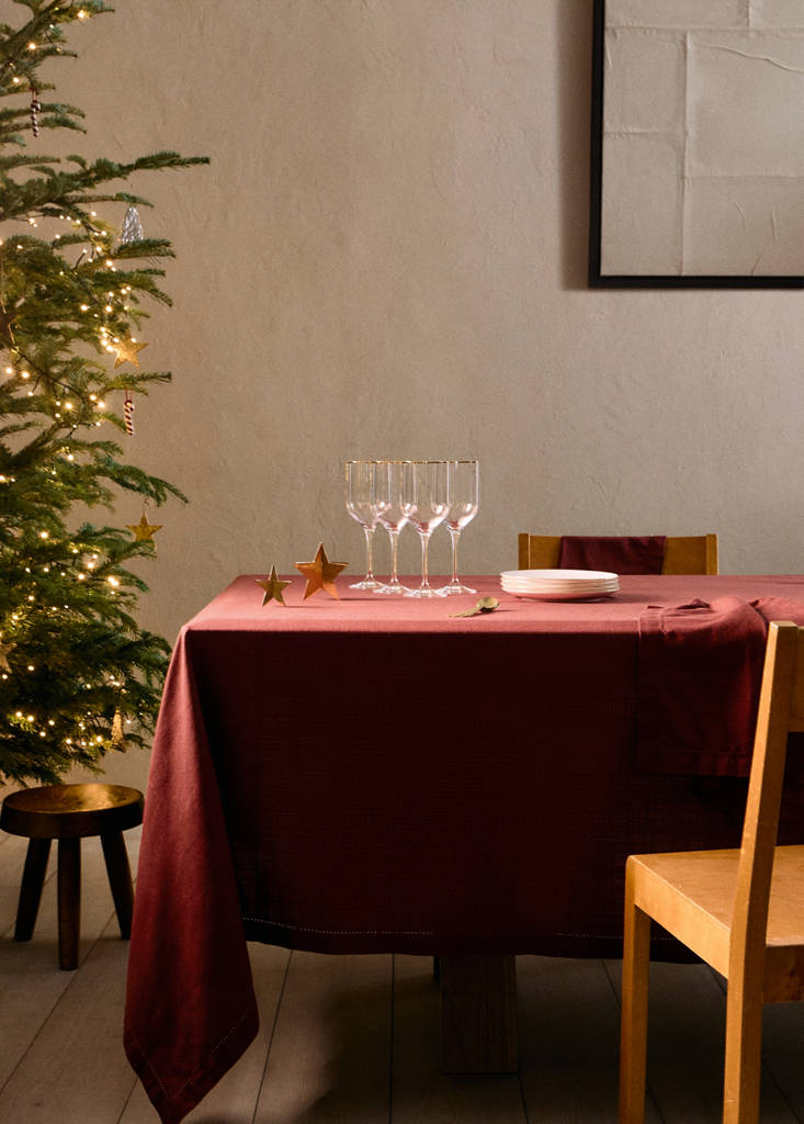 100% Cotton. Size: 170x350cm. Embroidered finish. Hemstitch embroidery. The best fabrics to set the table and share mealtime with your loved ones. Napkins available. Serves 8 to 10 people. Christmas Collection. Machine washable up to 40°C. Iron at a maximum of 200°C. Do not use bleach. Tumble dry allowed