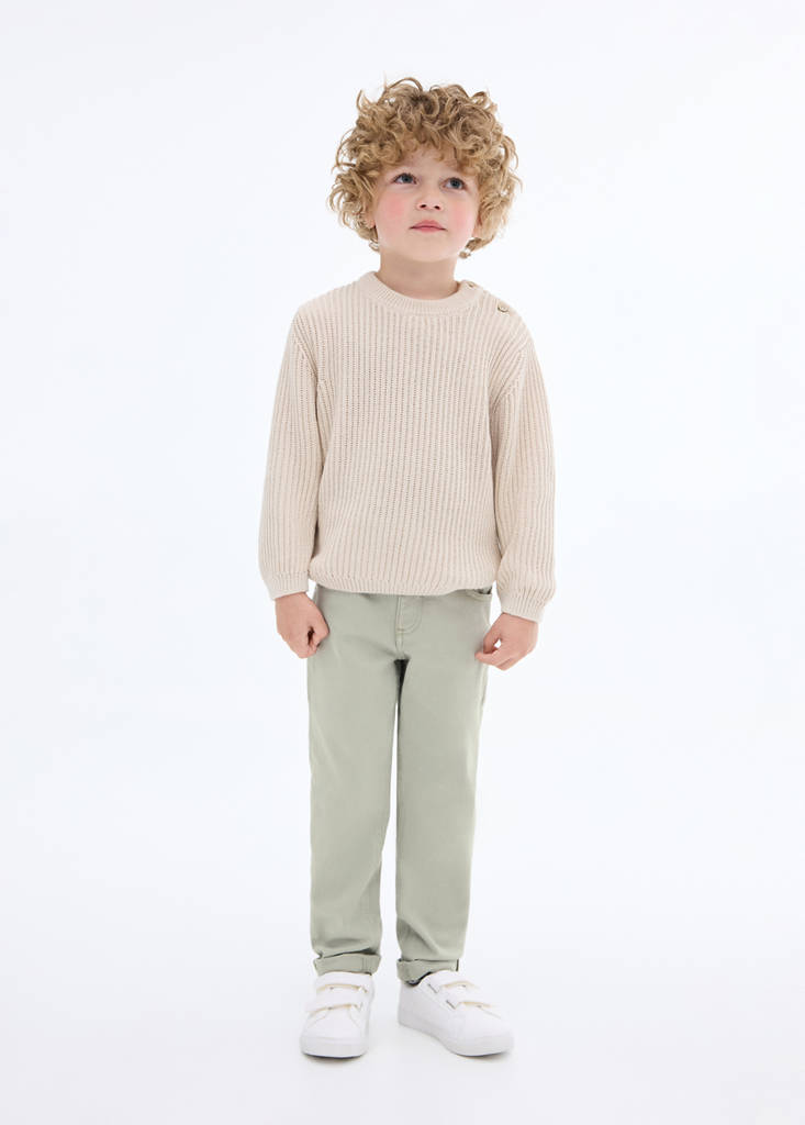 Cotton fabric. Denim fabric. Stretch fabric. Long design. Embroidered cross detail on the pockets. Belt loops. Elastic waist. One press stud fastening. Two side pockets. Rolled-up hem. Back to school