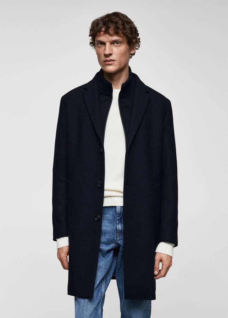 Wool mix fabric. Notched lapel collar. Perkins collar with detachable zip-closure option. Front closure with buttons. Long buttoned sleeves. Back vent at the hem. Long design. Slim fit. Inner lining. Interior pocket