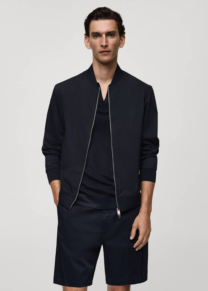 Cotton fabric. Lightweight technical-effect fabric. Bomber design. Bomber jacket with ribbed collar. Long sleeves with elastic cuffs. Zip fastening on the front section. Hem with elastic band. Untrimmed hem