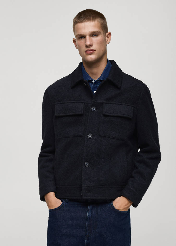 Recycled wool mix fabric. Regular fit. Two patch pockets with flaps on the chest. Two front welt pockets. Straight hem. Long sleeves with buttoned cuffs. Inner lining. Front closure with buttons. Classic collar