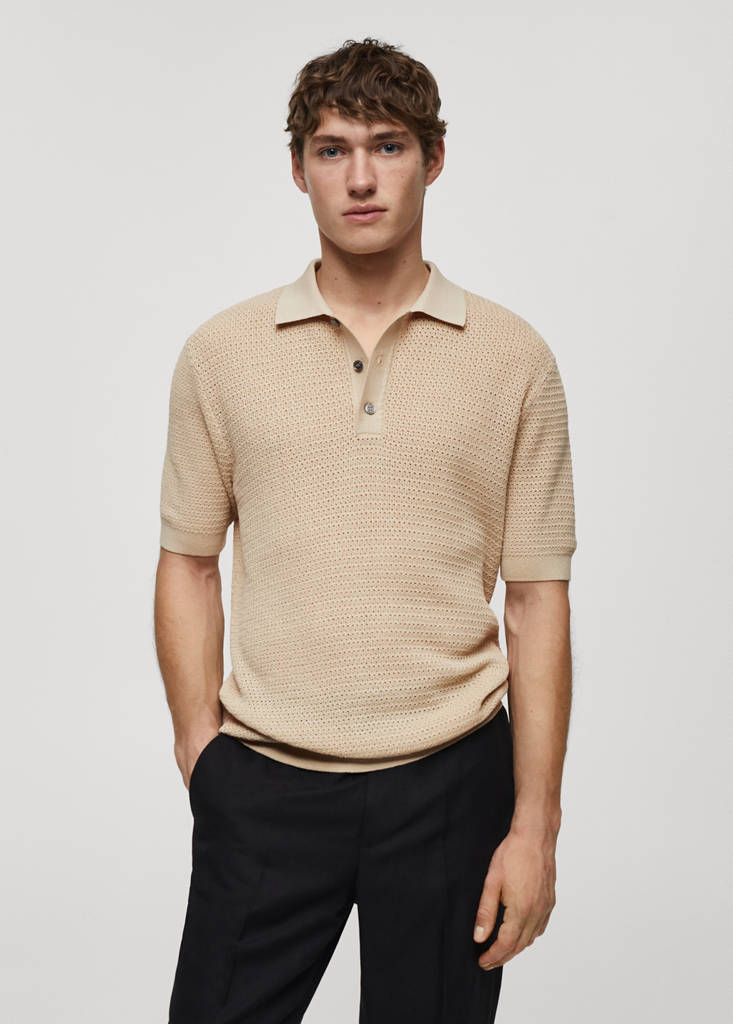 Openwork knit poloPrice historyInitial price struck through [kr 399 ]kr 399Current price [kr 309 ]kr 309-23 %Select a colourBeigeThe model is wearing size M and is 189cm tall.Select your sizeSNot available. I want it!MNot available. I want it!LNot available. I want it!XLNot available. I want it!XXLNot available. I want it!DimensionsNotify meFine knit fabric. Open-knit fabric. Contrast ribbed finishes on collar, sleeves and bottom hem. Polo-neck with button closure. Short sleeves. Straight hem. Crochet fabricDetails, composition and careStore availability