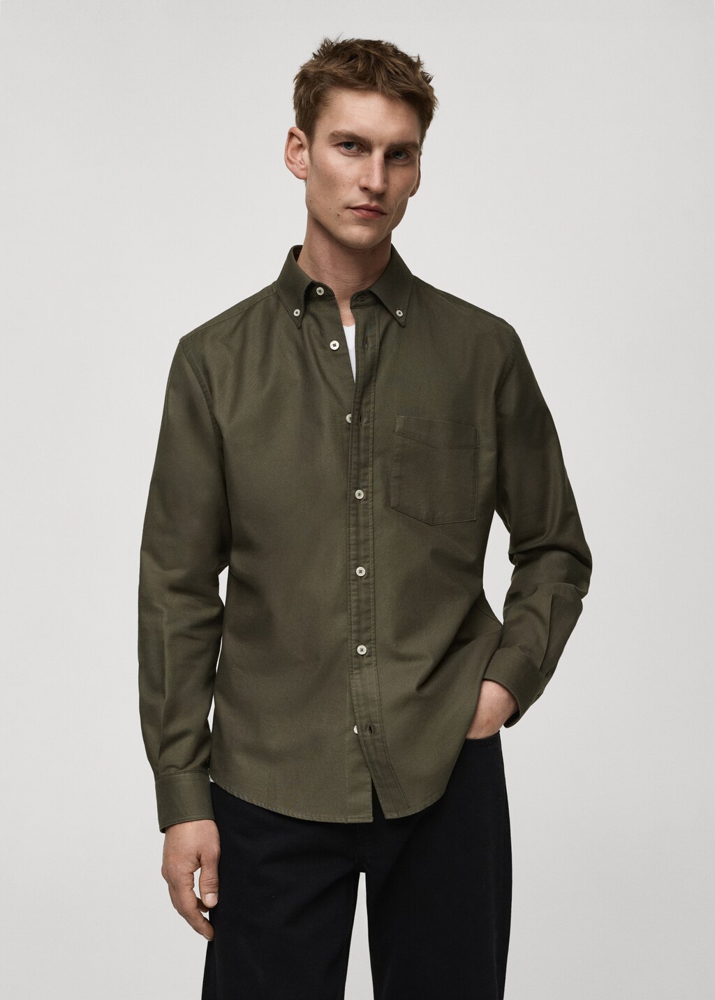 Classic fit. Lightweight fabric. 100% cotton fabric. Oxford fabric. Patch pocket on the chest. Buttoned collar. Button up. Buttoned cuffs. Rounded base. Classic design. Front closure. Standard design. Long sleeve.