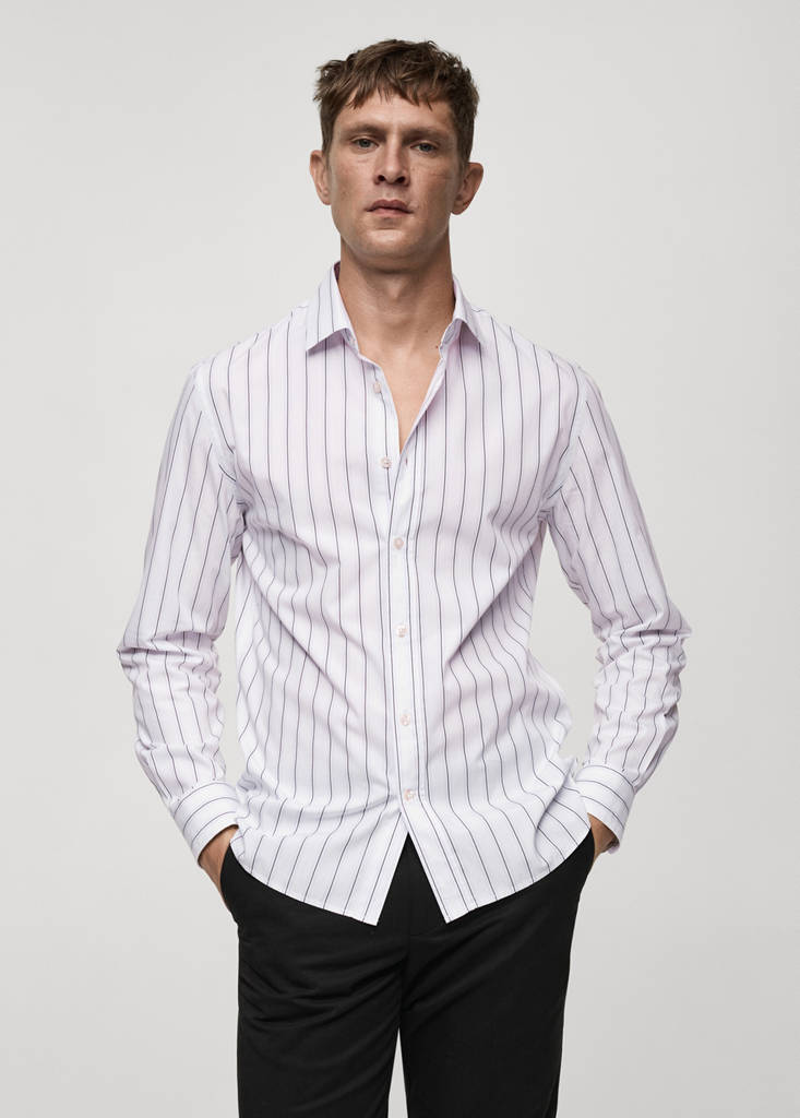 Regular fit. Vertical striped print. Long sleeves with buttoned cuffs. 100% cotton fabric. Rounded base. Front closure with buttons. Classic collar