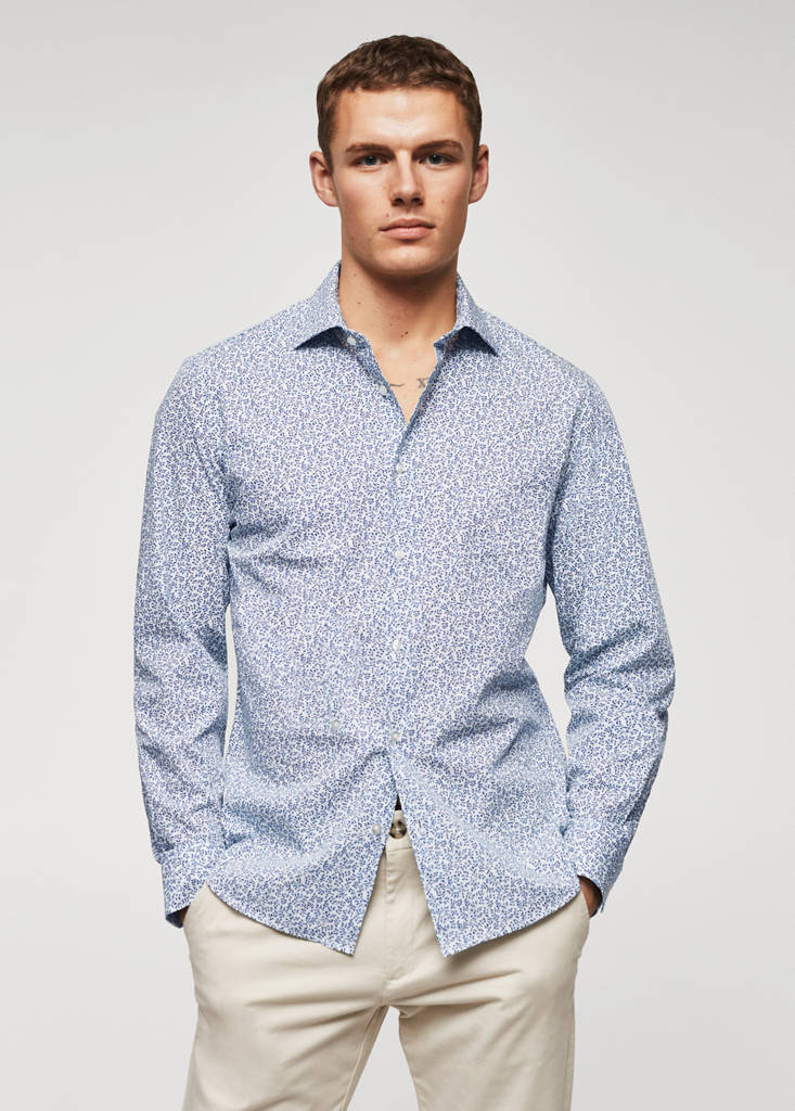 Slim fit. Cotton fabric. Printed design. Classic collar. Long sleeve. Button up. The model is 183 cm and is wearing a size M